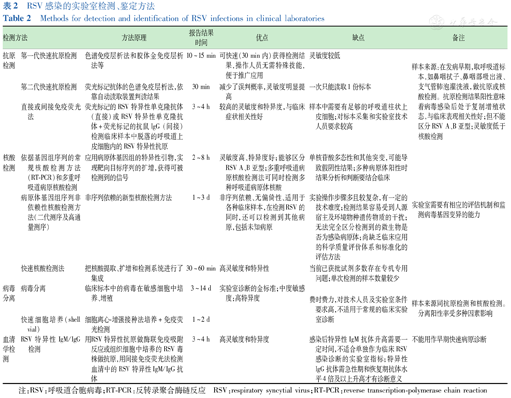 实验室检测结果是RSV感染的确诊依据。当前可用于RSV检测的方法包括抗原检测、核酸检测、RSV特异性抗体检测以及病毒分离[56,57]。除了病毒分离,其他3种检查方法在一些发达国家已作为医疗常规[58],目前国内也已有经国家药品监督管理局批准可用于临床检验实验室应用的试剂盒。各种实验室检测方法见表2。