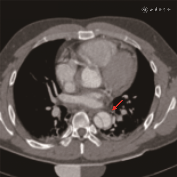 患者男,27岁,体重75 kg,身高170 cm,2018年8月因胸痛就诊于空军军医大学附属西京医院心血管外科。患者于15 h前无明显诱因感胸背部剧烈疼痛,伴心悸、气短、胸闷,无发热,无咳嗽、咳痰,无痰中带血,无腹痛、腹胀,无恶心、呕吐,无呕血、便血,能平卧,无夜间阵发性呼吸困难,无下肢水肿,无头晕、晕厥。面容正常,表情自如,神志清楚,查体合作。查体:体温36.5 ℃,脉搏78次/min,呼吸14次/min。心前区饱满,心尖搏动未见异常,位于胸骨左锁骨中线内侧1.5 cm。触诊心尖搏动位置同前,左锁骨中线内侧1.5 cm,未触及震颤,未触及心包摩擦感。心脏相对浊音界不大。听诊心率78次/min,律齐,未闻及早搏,心音可,各瓣膜区听诊未闻及病理性杂音。无异常血管征。血压126/71 mmHg(1 mmHg=0.133 kPa),否认高血压病史。吸烟15年,平均10支/d。计算机断层扫描血管造影术检查提示主动脉A型夹层(图1)。