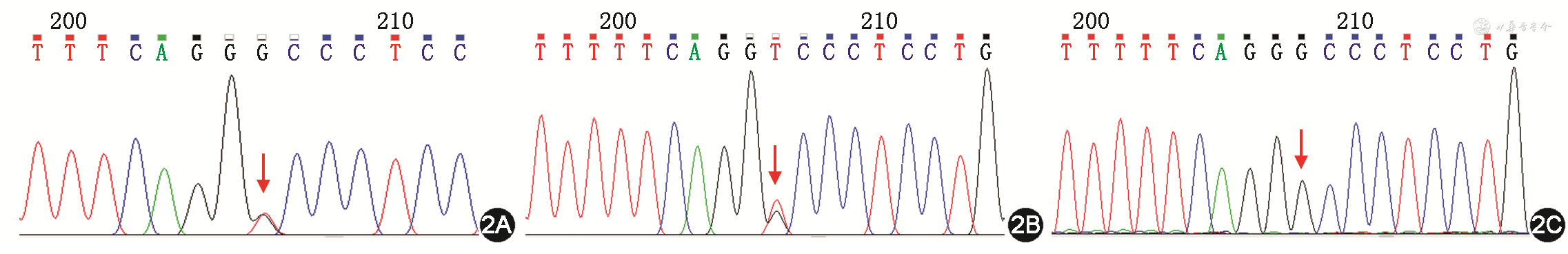 Sanger测序验证患者及家属的变异位点:取患者及其父亲、弟弟外周血基因组DNA,针对COL3A1(NM_000090)可疑致病位点,采用引物设计软件Oligo 7设计PCR扩增引物(正向5′-GCCTGCACTAAGTCACAGAATTCA-3′,反向5′-AATCAGTTGCAAGAAGCAATCTAATGC-3′),经加利福尼亚大学圣克鲁兹分校基因组学研究所数据库(University of California Santa Cruz,UCSC)In silico PCR验证引物序列的可靠性,由西安擎科泽西生物科技有限责任公司合成。采用PCR扩增候选位点所在的DNA序列,取PCR产物2 μl经琼脂糖凝胶电泳检测,扩增成功,对先证者及家系成员进行Sanger正反向测序,测序结果与UCSC数据库人类基因正常序列对比。