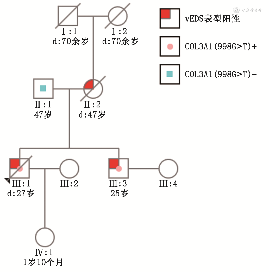 注:vEDS为血管型Ehers-danlos综合征。圆圈代表女性,正方形代表男性,箭头为先证者,斜线表示已死亡