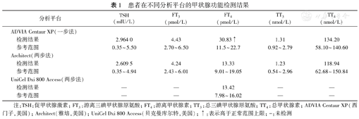 注:TSH:促甲状腺激素;FT3:游离三碘甲状腺原氨酸;FT4:游离甲状腺素;TT3:总三碘甲状腺原氨酸;TT4:总甲状腺素;ADVIA Centaur XP(西门子,美国); Architect(雅培,美国); UniCel Dxi 800 Access(贝克曼库尔特,美国); ↑:表示高于正常范围上限;-:未检测