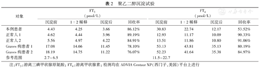 由于患者FT4检测结果在不同平台存在差异,因此不能除外检测干扰导致测定结果的假性升高。故进行聚乙二醇(PEG-6000)沉淀试验,取250 μL患者血清与等体积的25%PEG-6000或等体积的磷酸缓冲盐溶液(PBS)充分混匀,离心后取上清液进行甲状腺功能检测,同时计算回收率。公式如下:(25%PEG-6000沉淀后数值)/(PBS 1∶2稀释后数值)×100%。25%PEG-6000沉淀后患者FT4从30.83 pmol/L降低到12.17 pmol/L,回收率为53.52%。患者回收率明显低于正常对照人群和Graves病患者,说明患者FT4的检测受到了内源性抗体的干扰(表2)。