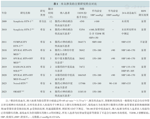 注:1难治性高血压,纳入标准为除估算肾小球滤过率<45 ml·min-1·(1.73 m2)-1、继发性高血压、肾脏解剖结构及一般情况不适合行经导管去肾交感神经术的患者,且所有患者在入组前均予3种及以上降压药物规范治疗,基线血压为在规律口服降压药物(血管紧张素转换酶抑制剂/血管紧张素受体拮抗剂、β受体拮抗剂、钙通道阻滞剂、利尿剂)治疗下测定。220~80岁轻中度高血压,纳入标准为所有入选者在入组前均已停用降压药物,基线血压为停用降压药物3~4周时测定,所有入选者均经肾血管造影等排除了不适合行RDN术的情况。T2DM, 2型糖尿病;SBP,收缩压;DBP,舒张压;-,无数据;1 mmHg=0.133 kPa