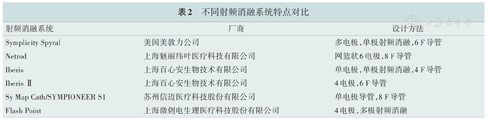 One Shot系统为美国Covidien公司生产的冷盐水灌注球囊螺旋导管器械,于2012年2月通过欧盟的CE认证,主要由灌注射频球囊导管和射频发生器构成。灌注射频球囊导管为整体交换球囊系统,其远端有个充满1个大气压气体的非顺应性球囊,球囊表面缠绕螺旋射频消融电极,可以进行单点消融,球囊扩张后可使电极与肾动脉壁接触,仅需一次2 min放电即可完成单侧肾动脉消融,缩短了消融时间。Ormiston等[56]进行了RHAS研究,纳入9例行RDN术患者,术后1、3、6、12个月收缩压分别下降(30.1±13.6)、(34.2±20.2)、(33.6±32.2)和(30.6± 22.0)mmHg. 2015年,Verheye等[57]进行了RAPID试验,纳入50例诊室收缩压≥160 mmHg且服用3种降压药(包含利尿剂)的高血压患者,评估了使用One Shot系统进行RDN术后6个月诊室收缩压变化,随访结果显示,与基线相比,术后6个月平均诊室血压下降20/8 mmHg,24 h平均动态血压下降11/6 mmHg, 12个月时平均诊室血压下降22/8 mmHg。两项研究均无手术相关不良事件发生。One Shot系统优势在于消融时间短,患者痛苦小,同时盐水灌注可以减轻靶目标周围组织损伤。不同射频消融系统特点对比见表2。