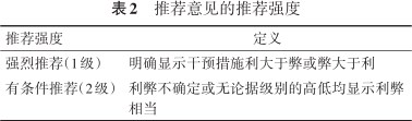 | 有条件推荐(2级) | 利弊不确定或无论据级别的高低均显示利弊相当 |