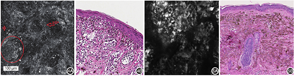 RCM特征:RCM下见表皮突向下延伸,真表皮交界处不均匀增厚,伴高亮度细胞团块样聚集;细胞体积增大,有一定异型性(图4A)。对应组织学上基底层痣细胞沿表皮嵴不规则成巢与融合[15,16](图4B);常见痣细胞巢的桥接,巢内可见正常细胞与非典型细胞混合;真表皮交界处可见嗜黑素细胞及炎症细胞浸润,可有嗜酸性纤维组织增生。