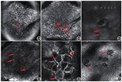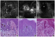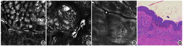 (3)有溃疡、结痂、糜烂的病灶:由于溃疡、结痂、糜烂面的高折光,利用RCM观察容易遗漏诊断信息。当溃疡、结痂、糜烂面积超过20%时,应在病灶边缘采集额外的堆叠图像以充分显示病灶,面积超过50%时,建议直接进行活检以减少误诊风险。