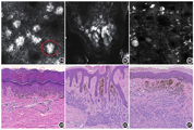 RCM特征[21,22,23]:表真皮交界处及真皮内可见单个或成巢高折光细胞,周边白斑区基底层色素明显减少,部分基底细胞环色素缺失,真皮乳头及浅层血管周围可见不等量噬黑素细胞及炎症细胞浸润(图6)。