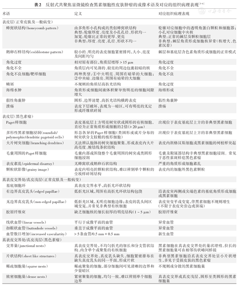 RCM检查黑素细胞性皮肤肿瘤的常用术语及对应的组织病理表现见表2[3,4]。