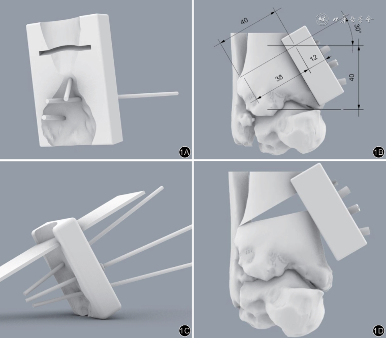 踝上截骨术于 1936年由Speed和 Boyd提出,1995年经Takakura 报道后推广,其治疗效果也得到广泛的认可[9, 10, 11]。踝上截骨术治疗内翻型踝关节炎可以矫正踝关节力线及胫骨纵轴线,使胫距关节面接近正常,从而改善踝关节炎症状,甚至逆转踝关节炎的进程[12]。踝上截骨术的要点主要包括设计截骨角度及截骨位置,通过楔形截骨矫正踝关节TAS角及TLS角,恢复踝关节力线。然而,传统截骨手术存在着诸多不足:(1)术中反复X线透视定位截骨线,不仅延长了手术时间,而且反复置针造成副损伤,增加了出血量。(2)克氏针定位后摆锯沿克氏针方向截骨,截骨角度及距离无法完全贴合克氏针,产生偏差。(3)在截骨过程中时常出现克氏针松动情况,后半程截骨需凭目测完成。截骨后术中无法准确测量胫骨的撑开高度,仅靠术中C臂X线透视下目测确定,目测角度存在偏差。(4)踝上截骨时为了利于矫形后胫骨对位及愈合,建议保留胫骨外侧骨膜及软骨组织、形成“合页结构”[13, 14];而传统踝上截骨时主要依靠主刀医师的经验,在骨皮质完全切断前及时停止,因此,保留对侧骨皮质难免出现偏差。如何解决以上难点,促使手术更简单而精准,我科采取了医工联合的模式,借助3D打印截骨导板克服以上难点。
