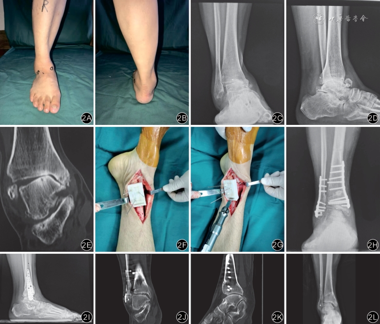 观察指标:(1)比较2组术中透视次数、术中出血量、手术时间及骨愈合时间。(2)采用疼痛VAS评分评估患者疼痛情况,美国足踝外科协会(American Orthopaedic Foot and Ankle Society,AOFAS)踝-后足评分评估术后功能、对线及疼痛(90~100 分为优,80~89 分为良,70~79 分为可,<70 分为差)。比较2组术前及术后末次随访组内和组间的VAS、AOFAS评分差异。(3)患者术后1、3、6、12个月及末次随访时复查X线片。比较2组患者术前及末次随访时的负重影像学测量指标:TAS角,在患者胫骨前后位X线上测量,为胫骨远端关节面和胫骨纵轴线之间的夹角(正常范围90°±3°);TLS角,在侧位X线上测量,为胫骨远端关节面与胫骨纵轴的夹角(正常范围81°±5°);TT角,在患者胫骨前后位X线上测量,为胫骨远端关节面和距骨关节面之间的夹角。以上指标的测量由同一位高年资骨科副主任医师完成,测量3次取平均值。