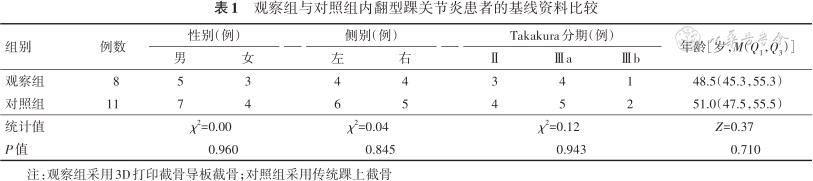 回顾性队列研究。纳入2019年1月—2022年6月徐州仁慈医院接受踝上截骨治疗的19例内翻型踝关节炎患者的临床和影像学资料。患者年龄36~63岁,其中,男12例、女7例,左足10例、右足9例,TakakuraⅡ期7例、Ⅲa期9例、Ⅲb期3例。按不同手术方式将患者分为:观察组8例,均采用3D打印截骨导板截骨;对照组11例,均采用传统踝上截骨治疗。