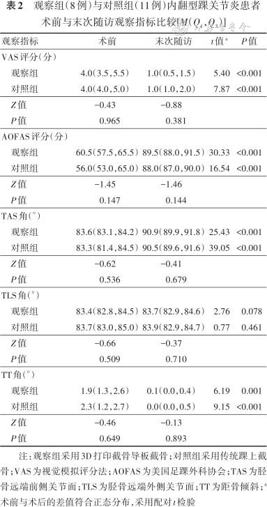 注:观察组采用3D打印截骨导板截骨;对照组采用传统踝上截骨;VAS为视觉模拟评分法;AOFAS为美国足踝外科协会;TAS为胫骨远端前侧关节面;TLS为胫骨远端外侧关节面;TT为距骨倾斜;a术前与术后的差值符合正态分布,采用配对t检验
