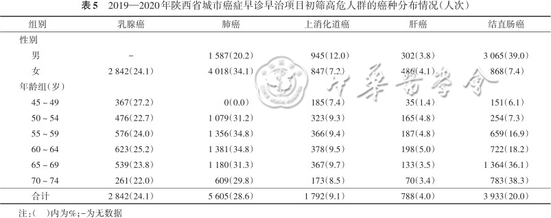 2019—2020年陕西省城市癌症早诊早治项目初筛高危人群的癌种分布情况(人次)