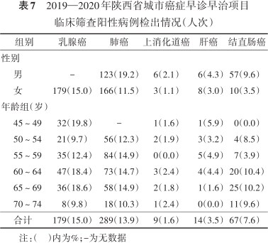 2019—2020年陕西省城市癌症早诊早治项目临床筛查阳性病例检出情况(人次)