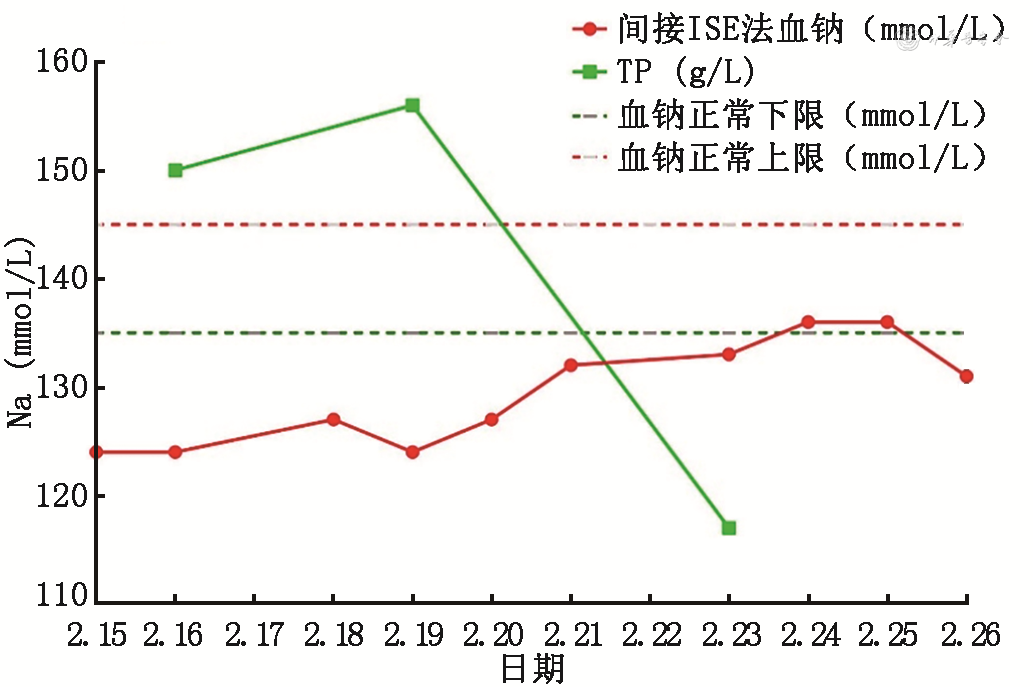 综上,本病例提醒对伴高脂或高蛋白血症的患者,间接ISE法测得的血清钠浓度可能偏低,判断真实血钠水平最好选用直接离子选择电极法检测,如使用血气分析仪检测血清样本,或者取动脉血气样本检测电解质水平,同时应结合血清渗透压水平及临床表现谨慎甄别,避免误诊误治。
