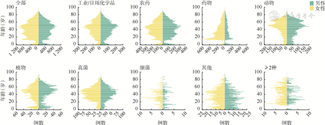 从不同毒物类型的人群分布来看,药物、真菌、细菌和≥2种毒物暴露导致的中毒病例中,女性多于男性,尤其是药物中毒,女性病例数是男性的2.15倍。工业/日用化学品、农药中毒以30~60岁人群为主,而药物中毒以10~40岁人群为主。在动、植物中毒中男性多于女性,动、植物中毒集中于 40~70岁人群。其他类型男、女性基本持平。见图1。