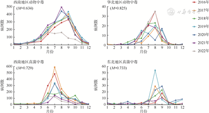 通过分析不同地区毒物类型的季节分布特征,发现工业/日用化学品、农药、药物中毒在各个地区全年均有发生,季节性较弱。真菌中毒在西南、东北地区有很强的季节性,在其他地区有明显的季节性。动物中毒在华北地区有很强的季节性,在西南及其他地区均有明显的季节性。植物中毒在西北和东北地区有一定的季节性,在其他地区季节性较弱。季节趋势突出的西南、华北和东北地区的毒物中毒时间分布见图2。