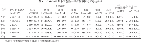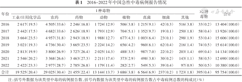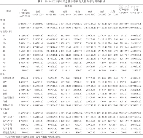 2016-2022年中国急性中毒病例人群分布与毒物构成