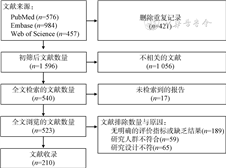 1. 基本情况:本研究从PubMed,Embase,Web of Science 数据库中分别检索得到576、984、457篇共计2 017篇文献。通过文献筛选最终纳入210篇,筛选流程见图1。