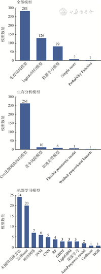 注:Simple score:简单评分;Probability Function:概率函数;Flexible parametric model:灵活参数模型;Weibull proportional hazards:威布尔比例风险模型;XGBoost:极限梯度提升法;SVM:支持向量机;CNN:卷积神经网络;RF:随机森林;GBDT:梯度提升决策树;LightGBM:轻量级梯度提升机;AutoPrognosis model:临床预测量身定制的自动涉及预测模型管道系统;CatBoost:分类提升算法;HGB:分层梯度混合法