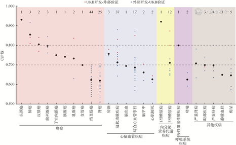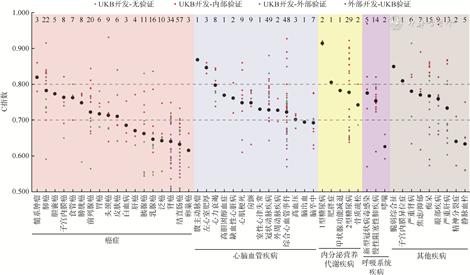 注:上方的数字代表各疾病的模型研究数量;黑色圆点代表C指数均值,按均值的降序排列;UKB:英国生物银行
