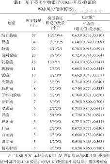 注:a UKB开发-无验证/UKB开发-内部验证/UKB开发-外部验证/外部开发-UKB验证;b均为UKB数据集中的结果;c 指多种癌症