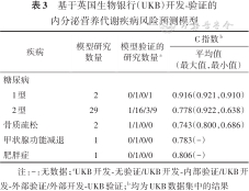 (3)内分泌营养代谢疾病:风险预测模型涉及4种疾病:糖尿病、甲状腺功能减退、肥胖和骨质疏松,共35个模型。其中糖尿病模型数量最多,效果最好,2型糖尿病在UKB数据中的C指数均值为0.778,最大值、最小值分别为0.922、0.638,其外部验证较多,C指数均值>0.700。其余疾病模型虽然C指数均值>0.700,但数量较少且缺乏外部验证,因此不具有代表性。见表3,图5,6。