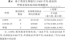 (4)呼吸系统疾病:风险预测模型涉及3种疾病:COVID-19、哮喘和COPD,共21个模型,COPD风险预测模型研究数量最多。COVID-19模型效果最好,C指数均值为0.776,模型的异质性较大(最大值、最小值分别为0.969、0.570)。COPD模型C指数均值为0.754,其中1个模型为UKB开发-外部验证,C指数>0.800。哮喘模型均为外部开发-UKB验证,但效果较差。见表4,图5,6。