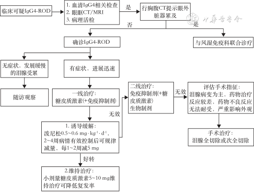 IgG4-ROD的治疗原则是控制病情、减轻症状、预防并发症、减少复发[18]。伴发其他系统受累的IgG4-ROD需参考风湿免疫科治疗方案,对无其他症状且发展缓慢的泪腺受累,可密切随诊。
