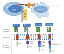 CAR技术是基因工程与免疫疗法的完美融合,是当前肿瘤治疗领域最具前景的研究方向之一,CAR是一种人工抗原受体,介导抗体靶向识别,它赋予细胞新的能力。CAR-NK细胞不仅通过CAR特异性识别表达抗原肿瘤的能力,而且通过NK细胞受体本身来消除肿瘤。同时决定NK细胞活性的是刺激和抑制信号的平衡,而不是抗原特异性[10]。用于NK细胞的CAR构建体由3个结构域组成:细胞外抗原识别结构域,跨膜结构域和细胞内细胞质信号转导结构域,外域包含来自识别肿瘤抗原抗体的单链可变片段(scFv)[11]。跨膜结构域将CAR结构锚定在效应细胞膜上。CAR与其抗原在肿瘤细胞上的结合触发信号转导级联,scFv可特异性识别靶细胞上的抗原,进而通过细胞内信号转导结构域,然后激活NK细胞直接或通过免疫系统的其他成分杀死靶标,因此该结构域也决定了CAR-NK细胞特异性及功能[12]。ScFv作为认为合成抗体,它的重链和轻链的顺序是可以人为决定的,到目前为止,在CAR-NK细胞的设计中,多数研究小组更倾向于VH-VL方向。但也有研究证明重链和轻链的顺序并不影响CAR的表达水平[13]。CAR的演变目前总结为四代,在第一代CAR中,CAR-T和CAR-NK细胞通常使用CD3ζ作为单个激活细胞内信号转导区域[14],然后在第二代和第三代CAR中分别带有2个和2个附加的共刺激信号。共刺激分子通常来源于CD28家族(包括CD28、ICOS)、肿瘤坏死因子受体基因家族(包括4-1BB、OX40和CD27)或信号淋巴细胞活化分子(SLAM)相关受体家族(包括2B4)[15]。最近,第四代携带转基因"有效载荷"的CAR,如IL-2或IL-15,已被设计用于改善CAR-NK细胞增殖,生存周期和抗原阴性肿瘤细胞的细胞毒性[16]。如图1为目前CAR-NK细胞的结构。