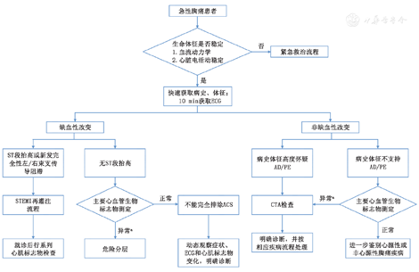 急性胸痛是临床常见症状之一,是以胸痛及胸部不适为主要表现的一组异质性急性疾病群[2]。与急性胸痛相关的疾病种类繁多且病情严重性差异极大,不仅包括ACS、AAS、PE、急性心肌炎和张力性气胸等高危致命性疾病,也包括胃食管反流、肋间神经痛、骨骼肌肉损伤、带状疱疹及神经官能症等疾病[12],故应立即对急性胸痛患者进行包括生命体征、心电图、病史及心胸血管影像检查,如经胸超声心动图(transthoracic echocardiography ,TTE)等,对病情进行初步评估,具体流程见图1。