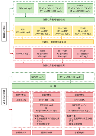 注:肥胖患者(身体质量指数≥30 kg/m2)BNP排除心力衰竭的截断值应<50 ng/L,BNP/NT-proBNP诊断截断值应降低50%;a20%~25%的HFpEF患者的BNP或NT-proBNP水平可能低于传统的心力衰竭诊断截断值(BNP<35 ng/L和NT-proBNP<125 ng/L);b心房颤动患者BNPgt;105 ng/L或NT-proBNPgt;365 ng/L; BNP, B型利钠肽;NT-proBNP,N末端B型利钠肽前体;LVEF,左心室射血分数;HFrEF,射血分数降低型心力衰竭;HFmrEF,射血分数轻度降低型心力衰竭;HFpEF,射血分数保留型心力衰竭