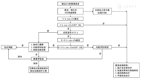 如无法保证hs-cTn测量,可采用基于con-cTn和风险评估集合的CDP[64],该CDP根据需要分别在就诊后0 h和6~9 h采血,并结合风险评估对患者进行分类,不同con-cTn阈值见国际临床化学与实验室医学联盟网站(http://www.ifcc.org/ifcc-education-division/emd-committees/committee-on-clinical-applications-of-cardiac-bio-markers-c-cb),具体流程见图5。