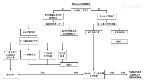推荐意见13 对临床可能性低的AAS患者进行D-二聚体及TTE检查,D-二聚体阴性且TTE检查无AAS直接征象可排除AAS诊断,其他情况需进一步完善增强CT检查;对临床可能性高或具有典型胸痛症状的AAS患者首选进行增强CT检查。