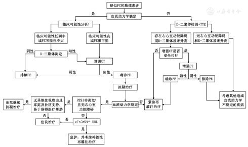 推荐意见14 对临床可能性低到中的PE患者进行D-二聚体检测,对检测结果阳性的患者进行增强CT检查,阴性患者可排除PE诊断;对临床可能性高的PE患者首选增强CT检查。