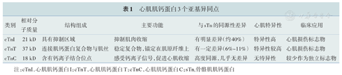 cTn是一种特异性表达在心肌细胞的结构蛋白复合物,包含cTnI、cTnT和cTnC三个亚基,各自结构特征见表1。