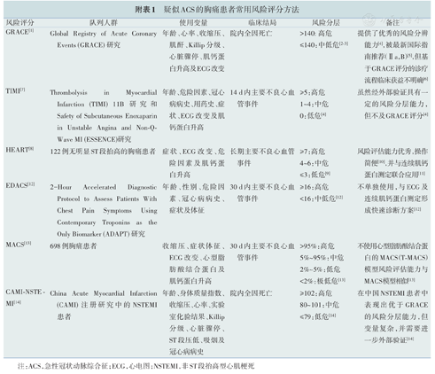 | EDACS[12] | 2-Hour Accelerated Diagnostic Protocol to Assess Patients With Chest Pain Symptoms Using Contemporary Troponins as the Only Biomarker (ADAPT)研究 | 年龄、性别、危险因素、冠心病病史、症状及体征 | 30 d内主要不良心血管事件 | ≥16:高危<16:中低危[12] | 不单独使用,与ECG及连续肌钙蛋白测定形成快速诊断方案[12] |