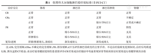 注:CR:完全缓解;CRu:不确定的完全缓解;PR:部分缓解;CT为评价淋巴结病变的主要手段。不论治疗前病变范围如何,治疗后均需进行胸、腹及盆腔CT检查;在治疗前骨髓侵犯阳性患者需评价CR疗效或治疗随访中有血常规异常等临床指征时需要进行骨髓穿刺及活检