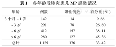 376例MP肺炎患儿,男180例,女196例,各年龄段比例见表1。女性MP感染率(34.69%)略高于男性(32.14%),但差异无统计学意义(χ2=0.820,P=0.365)。肺炎患儿的MP感染率为33.42%,其中大于3岁儿童感染率较高,随年龄增长有增加趋势,各年龄组差异有统计学意义(χ2=63.416,P<0.01)