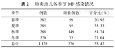 结合青岛地区气候因素,3~5月为春季,6~8月为夏季,9~11月为秋季,12月~2月为冬季。MP感染一年四季均可发病,以夏、秋季发病率最高,差异有统计学意义(χ2=68.161,P<0.01)(表2)。
