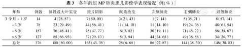不同年龄段的儿童MP感染后影像学表现不同。本研究显示,对于婴幼儿,以斑片影多见,病灶多位于双侧,单侧病灶者右侧较左侧多见。而对于学龄前儿童,肺段或大叶实变及斑片状阴影均多见,病灶多位于右侧,双侧发病者亦不少见。对于学龄儿童及年长儿,肺段或大叶实变占绝对多数,单侧多见。杨纪周[12]研究发现:小叶实质浸润性病变多见于婴幼儿,肺段实质浸润性病变以右下肺多见,右肺多于左肺,主要见于学龄儿童。刘艳晨[13]研究发现婴幼儿MP感染多表现为支气管肺炎,学龄前及学龄儿童以肺段实质浸润为主,易合并胸腔积液、肺不张,病灶发生部位具有一定特点,以单侧病变为主,右侧多于左侧。均与本研究结果相符。