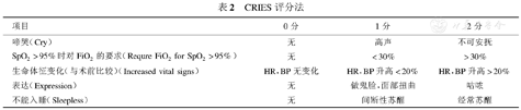 适用于新生儿和婴儿术后疼痛评估。包含5项,每项得分0~2分,其中1~3分为轻度疼痛,4~6分为中度疼痛,7~10分为重度疼痛(表2)。>3分应进行镇痛治疗[6,7]。有研究发现,CRIES在术后第1个24小时与VAS结果相对应,是评估小婴儿术后疼痛的有效、可靠且相对客观的手段[7]。