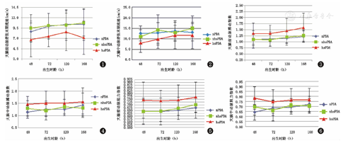 本研究中,对3组患儿出生后~48 h、48~96 h、96~120 h、120~168 h脑血流参数进行重复测量方差分析发现:hsPDA组ACA、MCA的Vd值显著低于nhsPDA和nPDA组(P=0.000,P=0.001;P=0.003,P=0.013),见图1,图2;ACA的PI、MCA的PI、ACA的RI、MCA的RI值显著高于nhsPDA和nPDA组(P=0.000,P=0.000;P=0.002,P=0.002;P=0.000,P=0.000;P=0.000,P=0.000),见图3,图4,图5,图6;nhsPDA组和nPDA组间上述参数比较差异无统计学意义(P>0.05)。3组间Vs、Vm比较差异无统计学意义(P>0.05)。