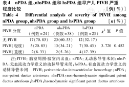 | PIVH分度 | nPDA(例数=24) | nhsPDA(例数=38) | hsPDA(例数=23) | χ2值 | P值 |