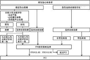 FFR的临床应用强化了病变功能学评价的重要性,并进而催生了冠状动脉功能性血运重建的冠心病治疗新理念,建议对于疑似冠心病患者参照流程图(图1)[23]进行病变功能学评价。