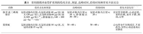 目前常用的药物为腺苷和三磷酸腺苷(ATP),两者等效。药物应用禁忌证包括:(1)二度及以上房室传导阻滞,或病态窦房结综合征(人工心脏起搏器植入者除外);(2)血液动力学不稳定;(3)痉挛性支气管哮喘;(4)腺苷或ATP超敏。罂粟碱是经典的微循环血管扩张剂,但因有严重室性心律失常等不良反应,目前已较少使用。其他药物,如硝普钠、多巴酚丁胺、尼可地尔和瑞加德松等也可诱发心肌充血,但尚需积累经验。