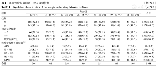 对南京医科大学附属南京妇幼保健院儿童保健科门诊符合纳入标准的2 458例儿童母亲进行儿童的饮食行为问卷(CEBQ)调查,获得儿童和母亲的社会人口学资料、儿童饮食行为问题的检出率,采用χ2检验和多元回归分析探讨儿童体质量指数(BMI)与儿童饮食行为的相关性。