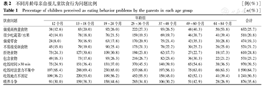 本研究以1~7岁儿童为调查对象,调查南京医科大学附属南京妇幼保健院儿童保健科门诊婴幼儿、学龄前期儿童3个月前的饮食行为(2014年6月至2015年8月)。纳入和排除标准:排除存在器质性疾病、急性传染性疾病和遗传性疾病,先天性心脏病、脑性瘫痪、腹泻及消化道畸形、消化道其他疾病等,均为来自南京医科大学附属南京妇幼保健院儿童保健科门诊健康体检儿童,且儿童母亲为儿童主要抚养人。共纳入儿童2 695例。按年龄分成6组:12个月、13~18个月、19~24个月、25~36个月、37~48个月、49~60个月、61~84个月组。