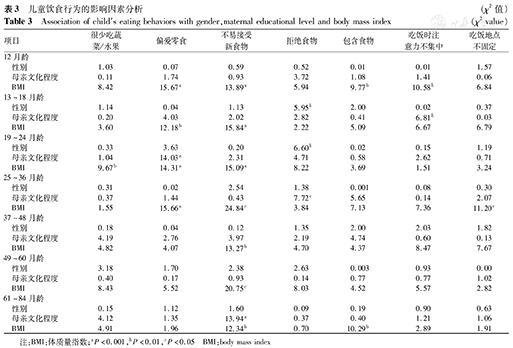 BMI仅在37~48月在不同性别(P=0.031)和母亲不同文化程度中差异有统计学意义(P=0.017),其余月龄组均无差异。在多数月龄组中,儿童偏爱零食和不易接受新食物与不同BMI组存在显著性差异。结果见表3。